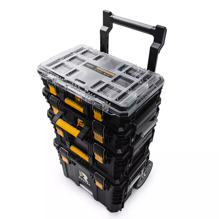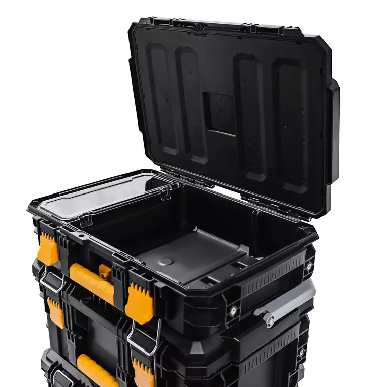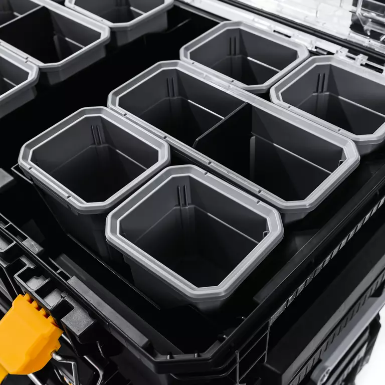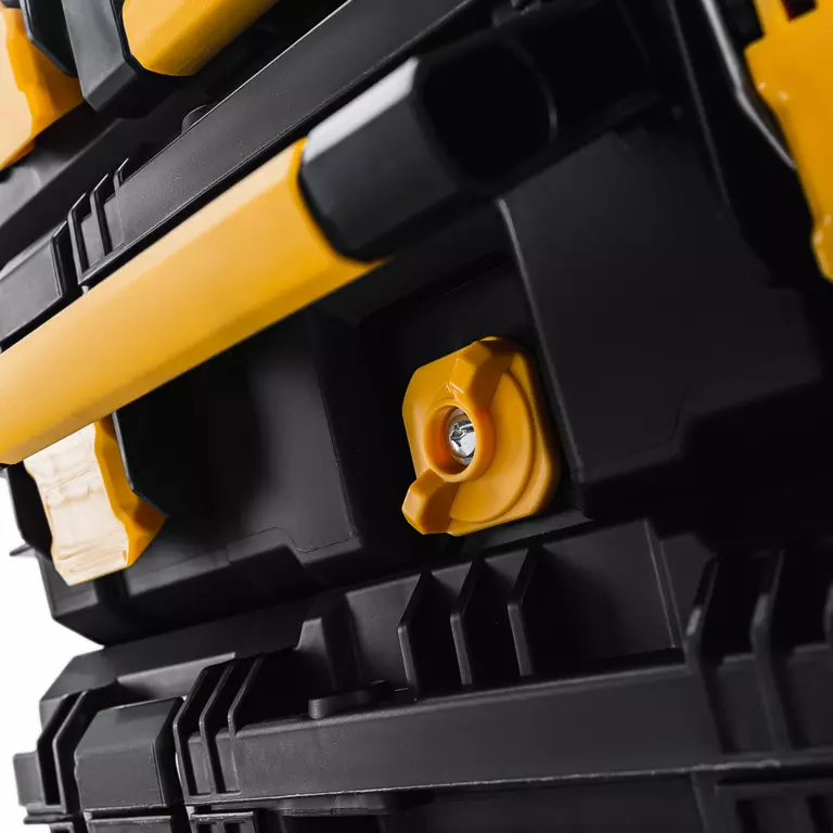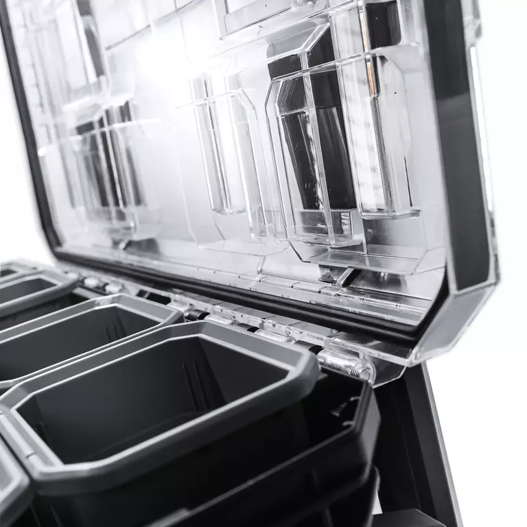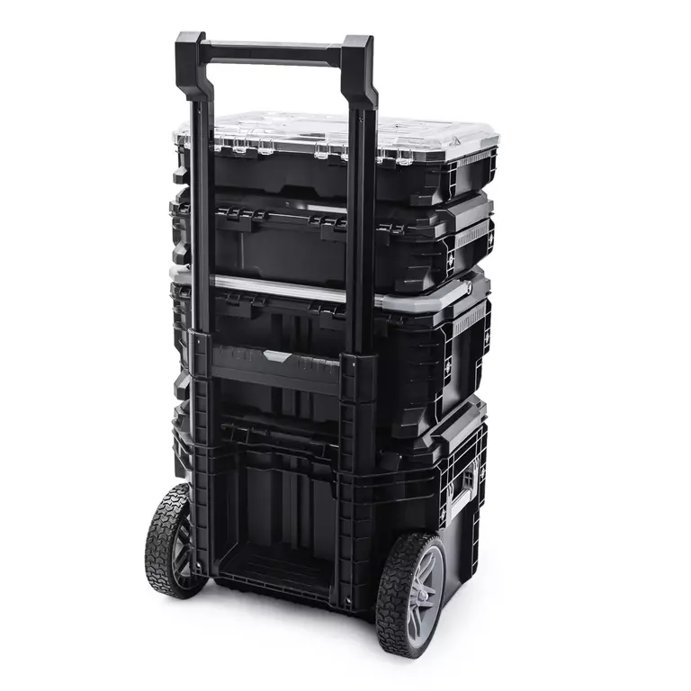Система состоит из четырех ящиков разного размера. Верхний — самый маленький: он разделен на отделы-контейнеры, в которых удобно хранить сверла, шурупы, гвозди. Средний и нижние ящики более крупные, в них можно положить дрель, шлифмашину и другой габаритный инструмент. Ящики можно штабелировать и скреплять между собой либо использовать по отдельности.