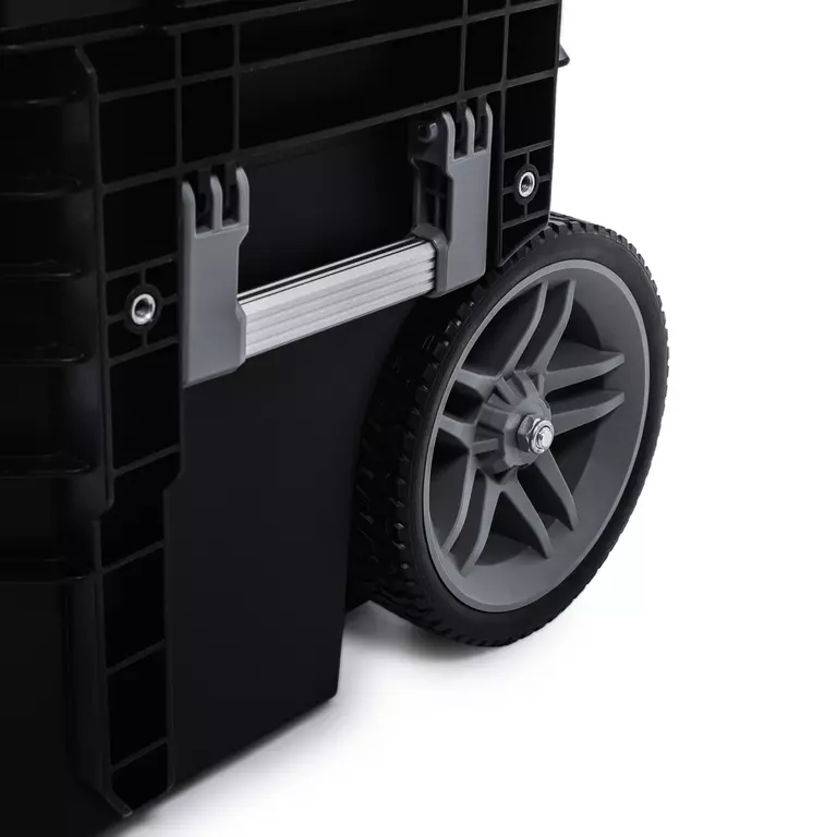 Ящики изготовлены из прочного ABS-пластика с матовым покрытием, устойчивым к царапинам и загрязнениям. Герметичная водонепроницаемая конструкция имеет степень защиты IPX6. Нижний ящик оснащен колесами и телескопической ручкой, что позволяет легко перевозить систему.